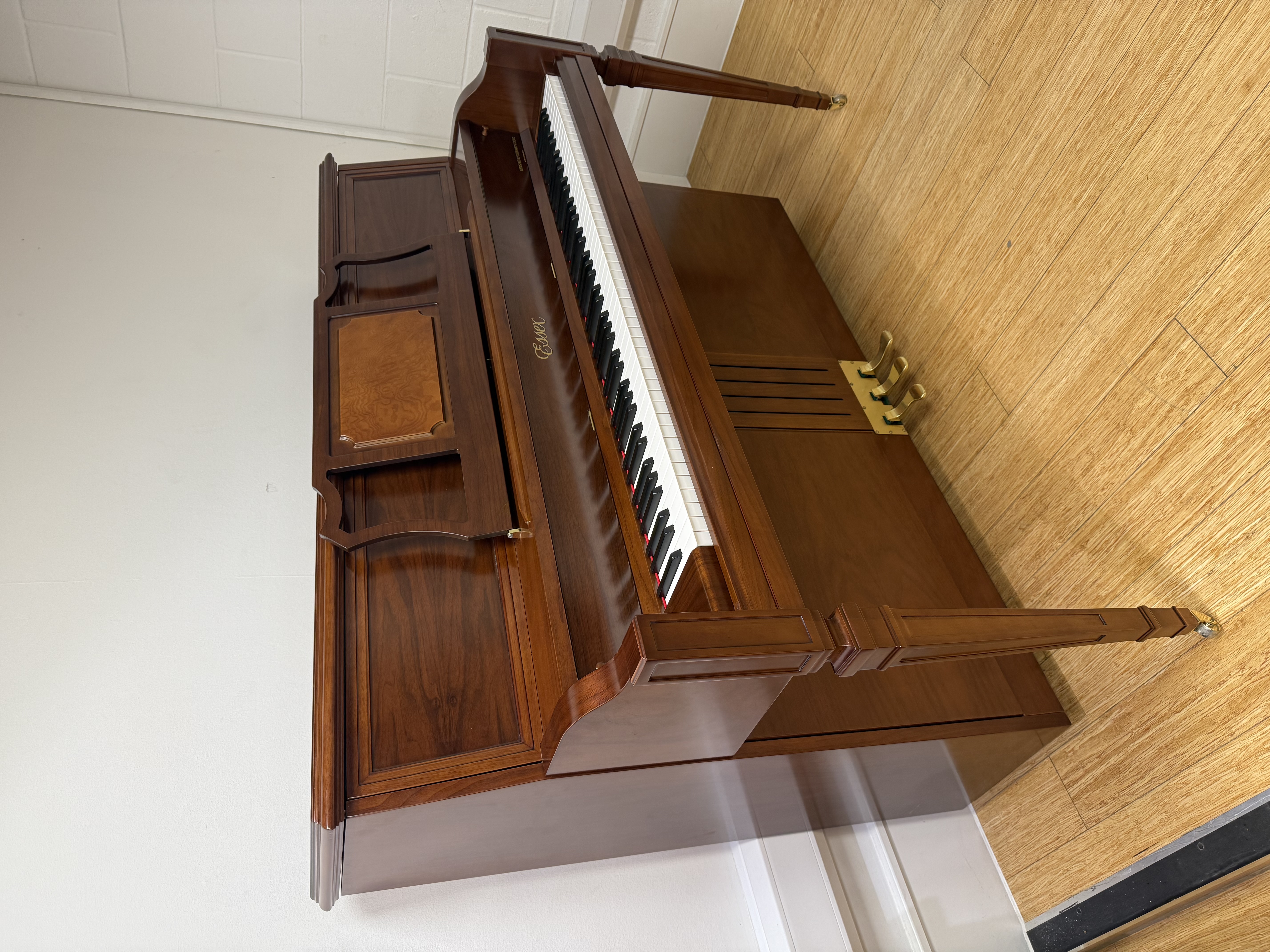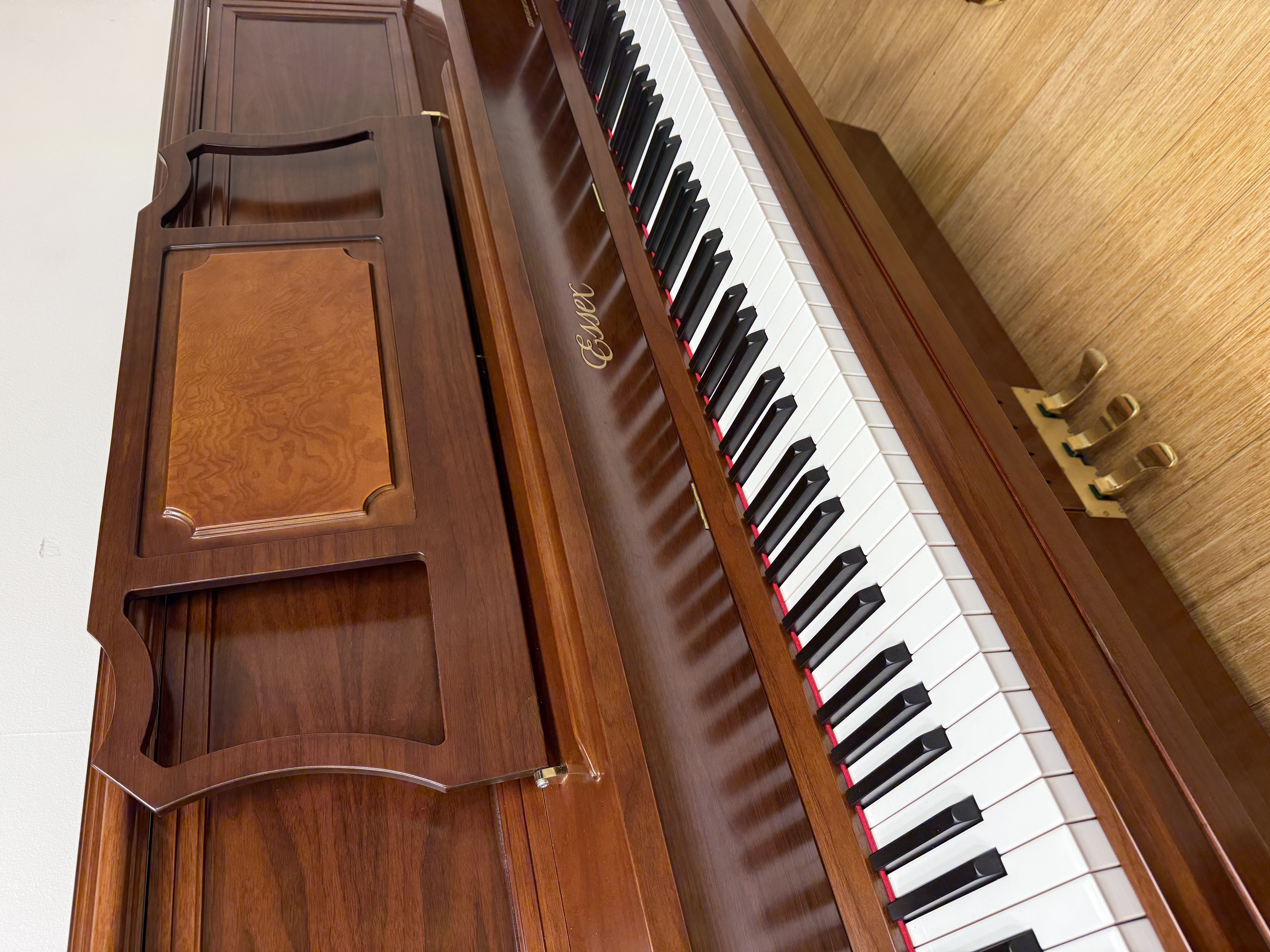 This pre-owned Essex EUP116 upright piano has a wonderful vibrant tone, and is in excellent condition throughout. Circa 10 years old, it has a beautiful console piano design, with a stunning mahogany finish.